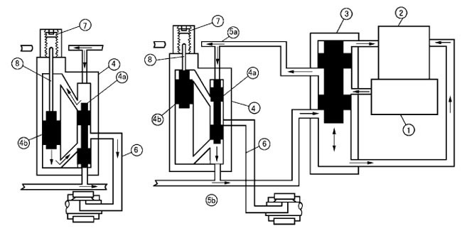 如上图所示,由泵压送来的润滑脂,经供油管5a输送至分配器4,进入先导活塞4a上部加压,将先导活塞4a压下,此时下部与供油管5b连通卸荷。随着先导活塞4a的下移,使主活塞4b上腔与先导活塞上腔连通,主活塞下腔与出油口连通,供送的润滑剂进入主活塞上腔,推动主活塞下移,将其下腔的润滑剂经给油管6压送到润滑点,完成第一周期的给油动作。