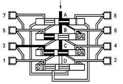 这时活塞B至D从左侧向右侧运动,按以上相反方向顺序动作完成一个周期循环并可重新开始一个新的循环。