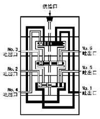 | 4、流入的润滑剂推动活塞A向左移动、左腔的润滑剂压向NO.3吐出口经外部配管送向润滑点。当活塞A运动至左极限时活塞C右腔开始进入润滑剂。 |