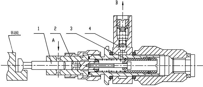 1—工作活塞 2—控制活塞 3—调节螺套 4—单向阀