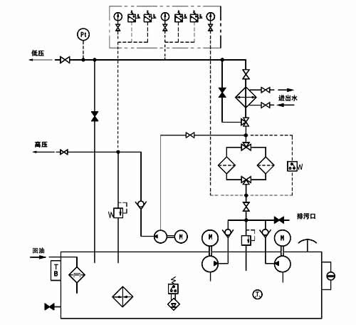 本产品主要由油箱(其内装有磁网过滤器)、低压油泵装置、高压油泵装置、双筒网片式过滤器、手动高压油泵、冷却器、管道、阀门、仪表盘及电控柜等组成。